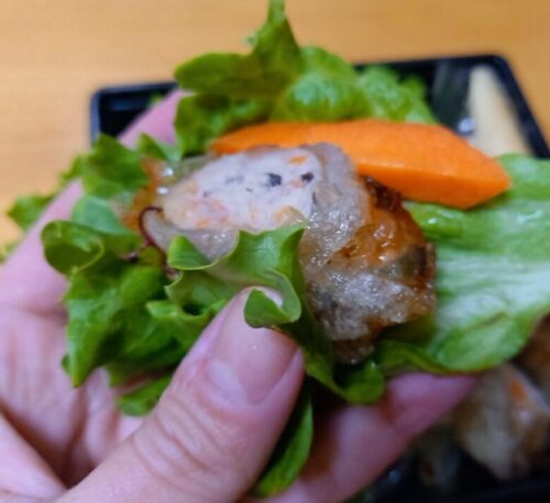 海老のすり身入りの揚げ春巻は、オリジナルソースをたっぷりつけて、野菜と一緒にレタスを巻いてかぶりつく!