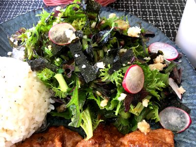 サラダも絶品!わさび菜とラデッシュ、海苔などで作られています。