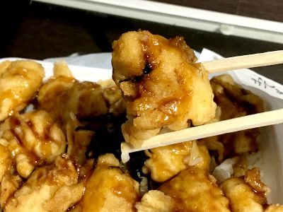 甘めの照り焼きソースに天ぷら風のチキンがごろごろと!