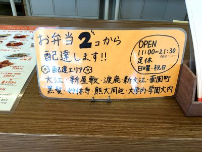 配達エリアは、大江・新屋敷・渡鹿・新大江・薬園町・黒髪・妙体寺・熊本大学周辺・熊本大学内・熊本学園大学内と広範囲。