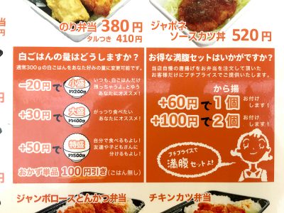 もちろん、量は大盛りばかりではなくて小盛りも対応していますので、小食の方もご安心ください。小盛りの場合は、20円の値引きもして頂けます。