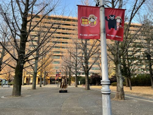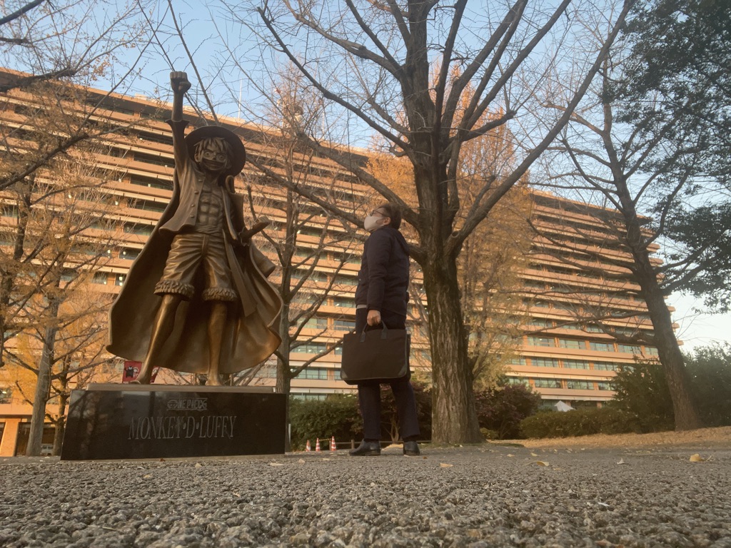 熊本県庁に到着すると、出迎えてくれるのがマンガ「ワンピース」の主人公ルフィ(像)。