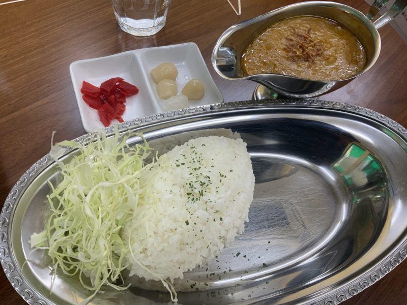 こんな感じでやってきます。ちなみに朝カレーも新宿カレーで、380円で同じ量ですが、ライスとルーのみ。最初から盛られてやってきます。