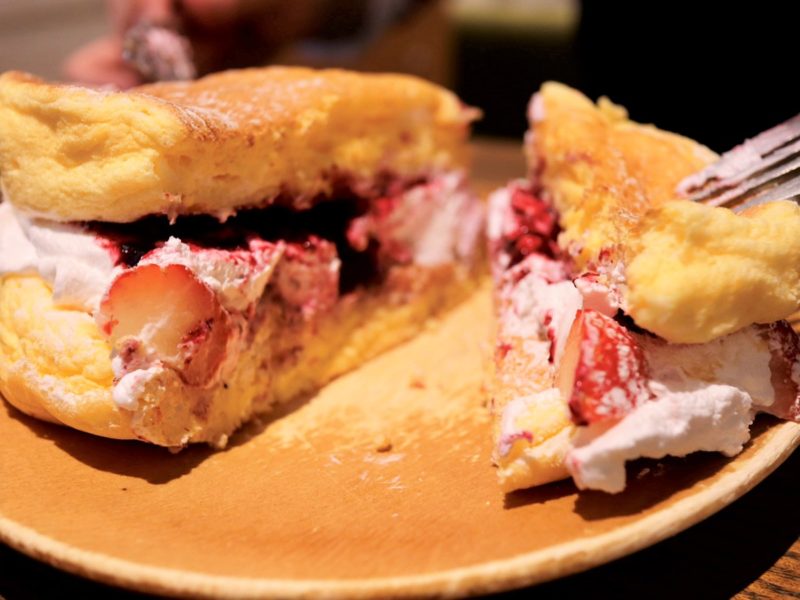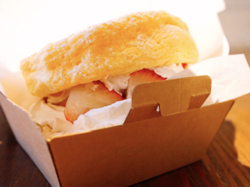 溢れんばかりに入ったいちごと生クリームに甘酸っぱいいちごのソースがかかっています!甘すぎないクリームをふわふわの生地でバンズになっているパンケーキバーガーはいくらでも入ってしまいそう!普段は甘いものよりポテチ派のぼくですが、最後までおいしく食べれました!