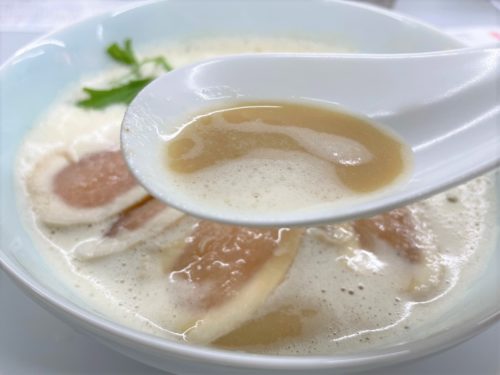 泡がクリーミーで、思った以上に濃厚でコクのある味。鶏をベースに、とんこつも入っているそうで、あっさり系を想像していましたが、意外にもこってりと深い味わいです。