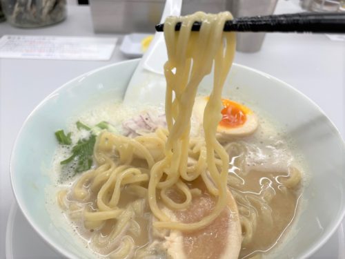 そして麺は、しっかりした中太麺で、するするっと口の中に入ってくるような、リズミカルに弾む食べ応えのある麺。スープともよく絡みます。