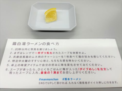 席に着くと、まずレモン一片と、食べ方の案内をもらえます。