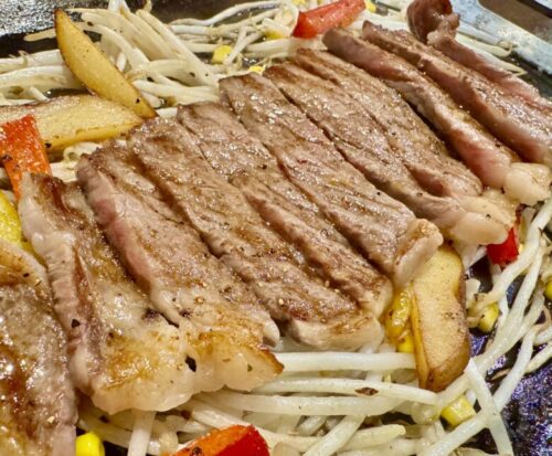 熱々の鉄板の上に、お野菜とお肉が豪快に乗って