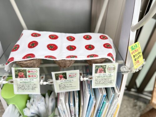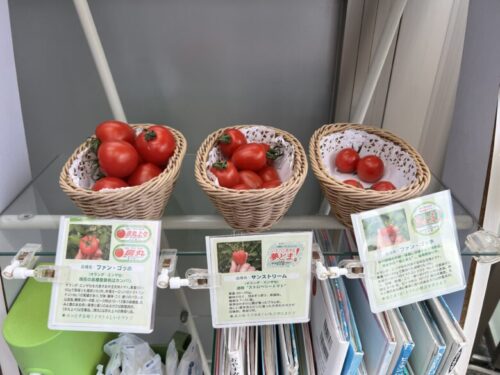 その時期に収穫されたトマトが食べ比べできる神サービス。しかも試食用に小さくカットされたものではなく、トマトが丸ごと気前よく置いてあるんです。