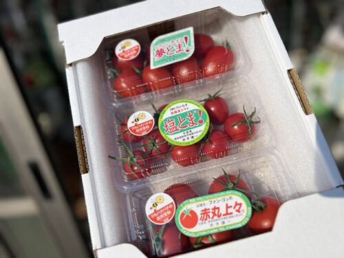 普段スーパーでよく買うトマトらしい馴染みのある味の「赤丸上々」、真ん中の通称ストロベリートマトと呼ばれる「夢とま」は、POPにも書かれている通りあと味はスイカのようにすっきりした味わいです。