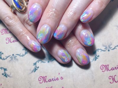 2児の子持ちでもある筆者は、トレンドのユニコーンパウダーで輝く今旬ネイルに仕上げてもらいました♪