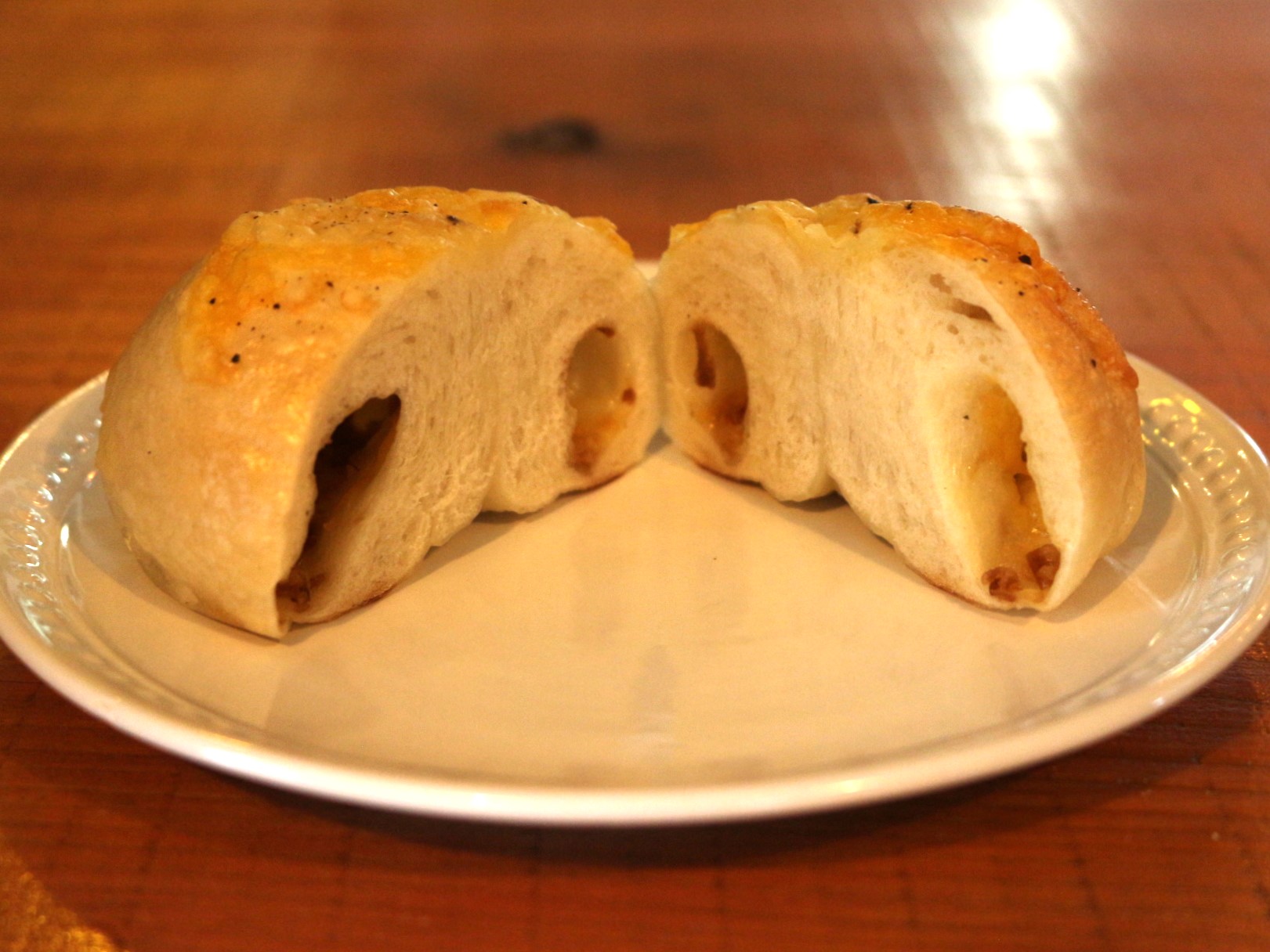 外側はしっかりした歯ごたえのある生地です。生地美味しいなーっと思っていると、その後オニオンの風味が口いっぱいに広がって頭の中もオニオンが占領。幸せなベーグル。
