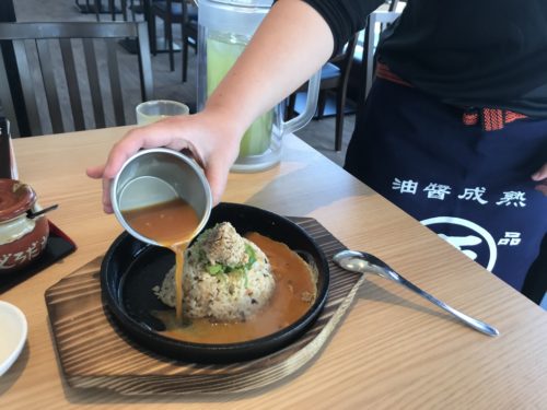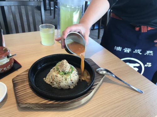 店員さんが円墳チャーハンの周りに、といた卵を流し込んでくれます。