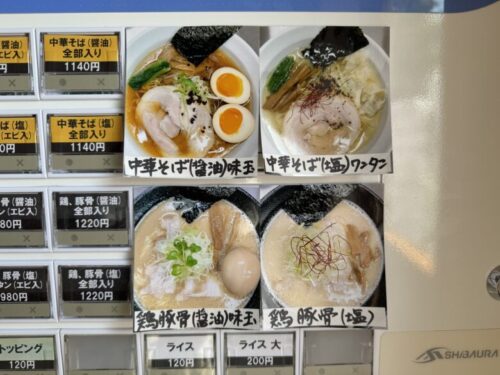 中華そば(清湯スープ)と、鶏豚骨ラーメン(白湯スープ)の二種類をそれぞれ醤油味と塩味から選ぶというメニュー。トッピングは味玉、チャーシュー、ワンタン、それぞれ各120円です。
