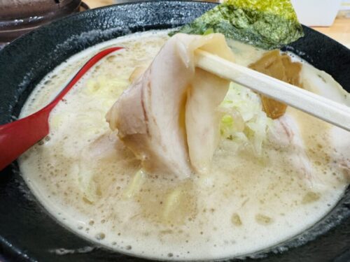 チャーシューは薄めで、油の部分がとろりと口の中でとろけます。お口の中でスープもチャーシューもとろけてすっかり心までとろとろ。
