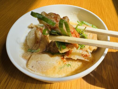 ネギと一緒にパクリ。ふわっふわの味濃い目のホルモンに大満足です。是非残ったスープをご飯と混ぜて食べてくださいとの事でした。満たされすぎて、幸せなランチ時間でした。