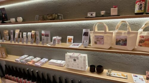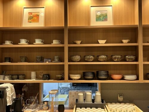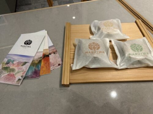 器や茶葉などいろいろな商品が置いてあり、まるいわでは和菓子とお茶を楽しむことができます。