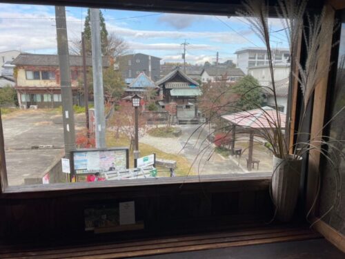 窓からは、向かい側にある神社・お伊勢さんが眺められるつくりになっていて、これもまた一興。