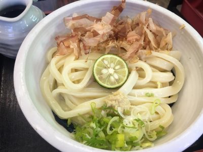 こちらは、ざるうどんにすだちをトッピング。冷たいうどんだと、さらにコシの強さを感じられます。