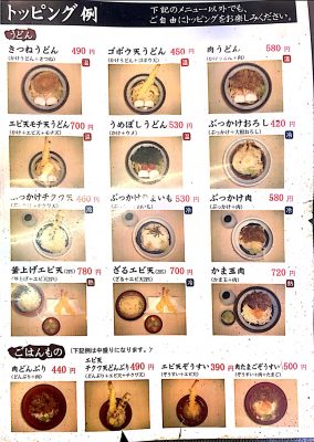 うどんは、かけうどん、釜上げなどのベースのうどんに、たまごやエビ天などのトッピングを選ぶ方式です。