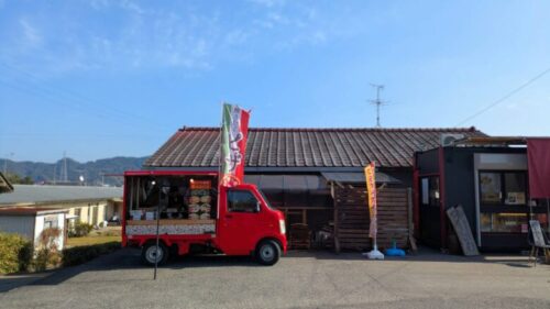 宇城市小川町ののどかな景色の中に、真っ赤なキッチンカーが佇んでいました。