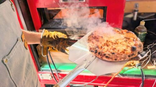 炎の強さ、生地の膨らみ、チーズの溶け具合、ほんのわずかな焦げ目まで見逃さず、まるでピザと会話するように焼き上げていきます。