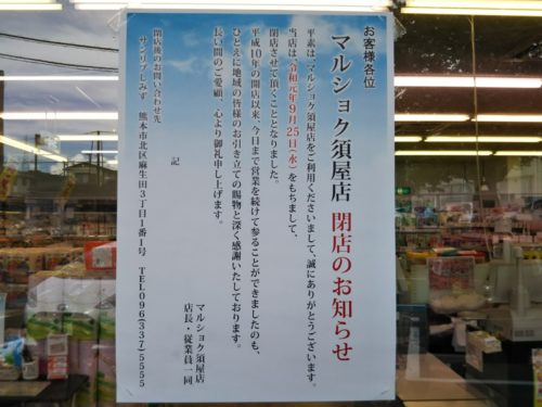 合志市須屋にあるマルショク須屋店が9月25日で、熊本市北区にあるマルショク武蔵ヶ丘店が9月30日で閉店するそうです。