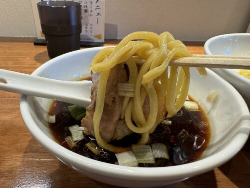 スープはラーメンと同じ醤油味ですが、ラーメンよりも更に濃い味となっております。塩分が疲れた体に染みます。