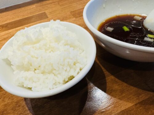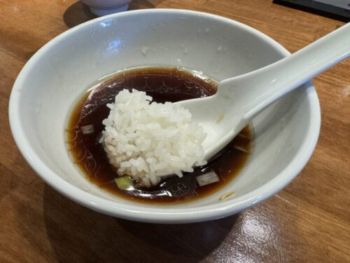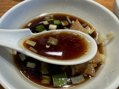 表面に油がうっすら。そして澄んだ醤油はラーメンよりもかなり濃く、そのまま飲んでしまうには塩気が強いです。