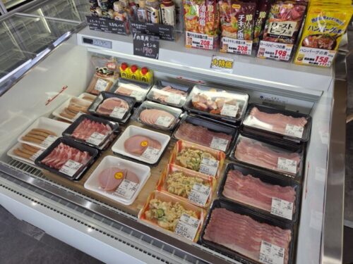 ショーケース前の平台にもパックに詰められたお肉がズラリ。