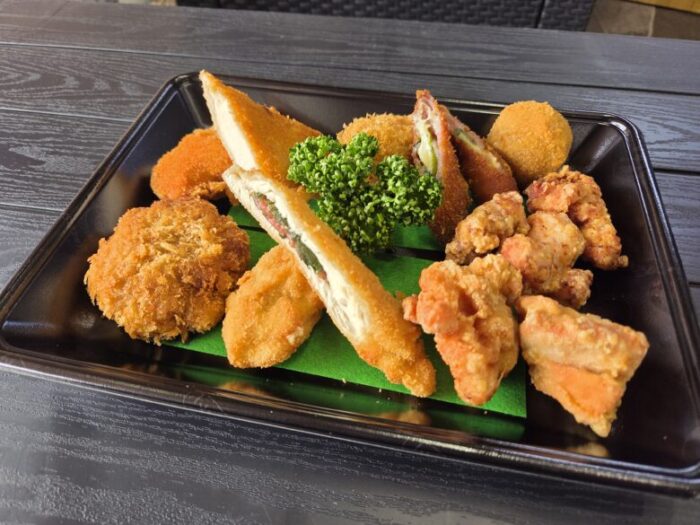 左奥から時計回りにチキンカツ、牛すじコロッケ、豚チー、豚トマ巻き、唐揚げ(塩)、唐揚げ(しょうゆ)、梅大葉ささみ揚げ、メンチカツです。
