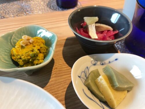 この日はアジ南蛮がなかったそうで、このしろでしたが、通常は牛深の漁師さんが作られているアジ南蛮を出されていて、こちらもおすすめとのこと。生麩やかぼちゃとブロッコリーの副菜も、体が喜ぶ優しい味でした。