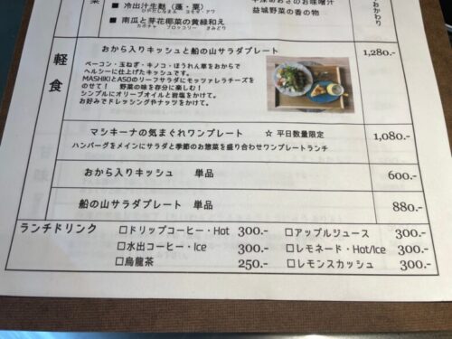 おから入りキッシュと船の山サラダプレートは、14時までのランチタイム後も注文可能です。