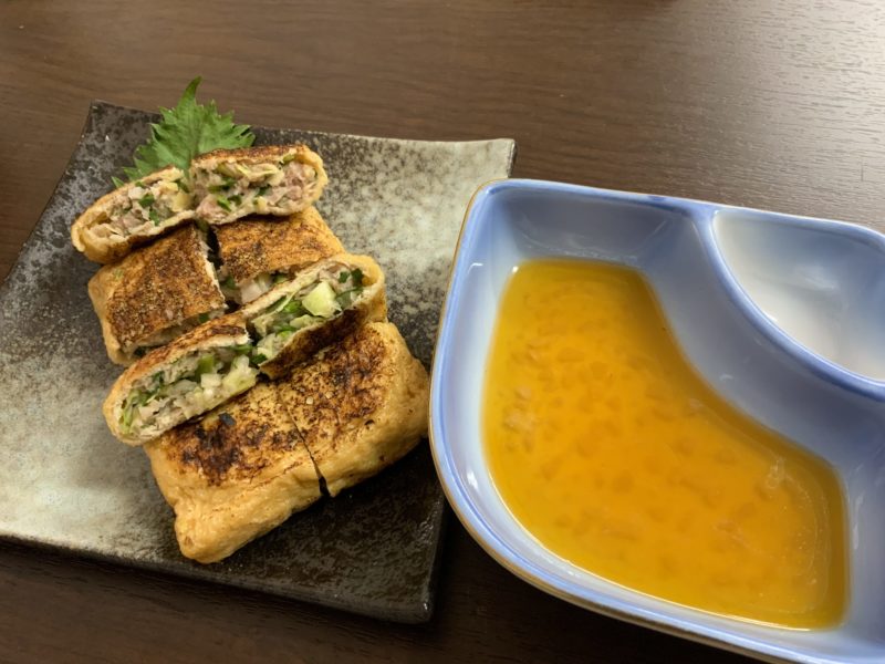 「あげ詰めギョーザ」は、油揚げにギョーザの種を詰めて焼いたもの。実はこれ、店主の実家で振る舞われていた家庭料理で、お店を開く際に看板メニューとしてレシピを伝授されたそう。