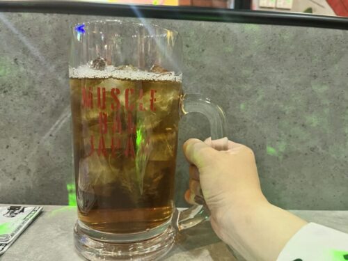 生搾りしてもらったドリンクはマッスルと乾杯して飲むことができます!乾杯マッスル!!!