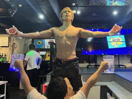 また、オススメメニューのマッスル生搾りも様々な曲に合わせてパフォーマンスをされるのですが、セクシーなの、キュートなの、どっちが好きなの?といったリクエストにも応えていただけます。