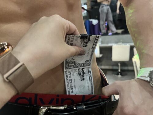 おもてなしメニューの分はマッスルドルをパンツに挟んでお支払い。セクシー!