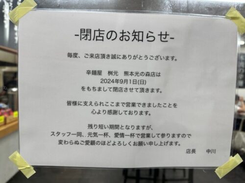 【閉店情報】激辛ラーメンで有名な元祖辛麺「桝元」光の森店が閉店しとる!