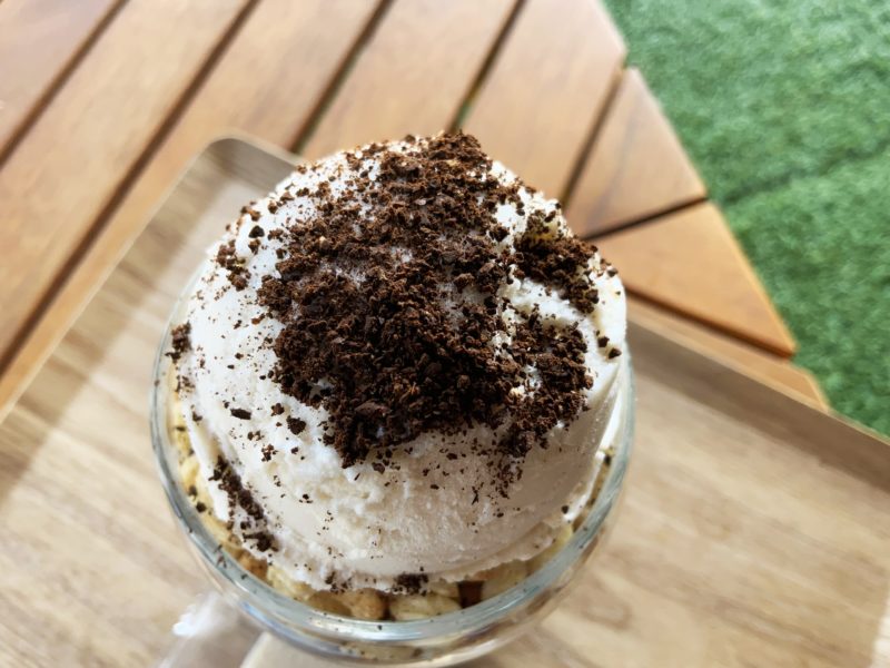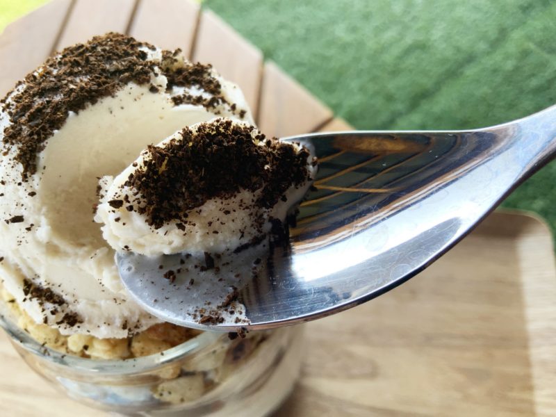 上にはコーヒーの粉がたっぷりかかっています。一見すると苦そうですが、下のコーヒーミルクジェラートが丁度いい甘さなので、苦味を相殺してくてます!