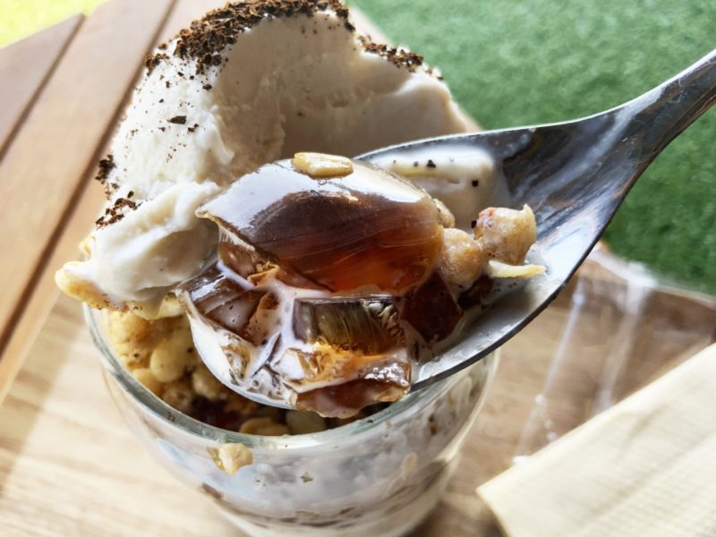 手作りのコーヒーゼリーとグラノーラのフレークが2層ずつ、バニラアイスとコーヒーミルクジェラートもたっぷり詰まっています。