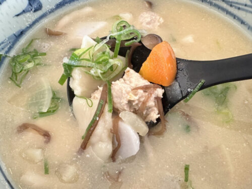 「だご」は弾力があり食べ応えがあり、にんじん、きくらげ、だいこんなど野菜もたっぷり。