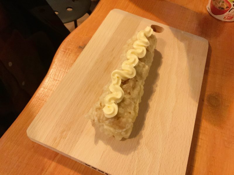 続いてちくわサラダ。色合いが似ていてまな板と同化しつつあります。これも熊本名物なので、他県との差別化ができるでしょう!!レッツマヨ!
