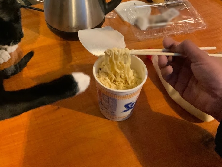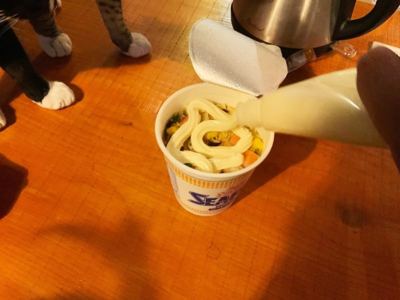 最後にカップ麺。なんか一番マヨに合いそうなシーフードにしてみました。