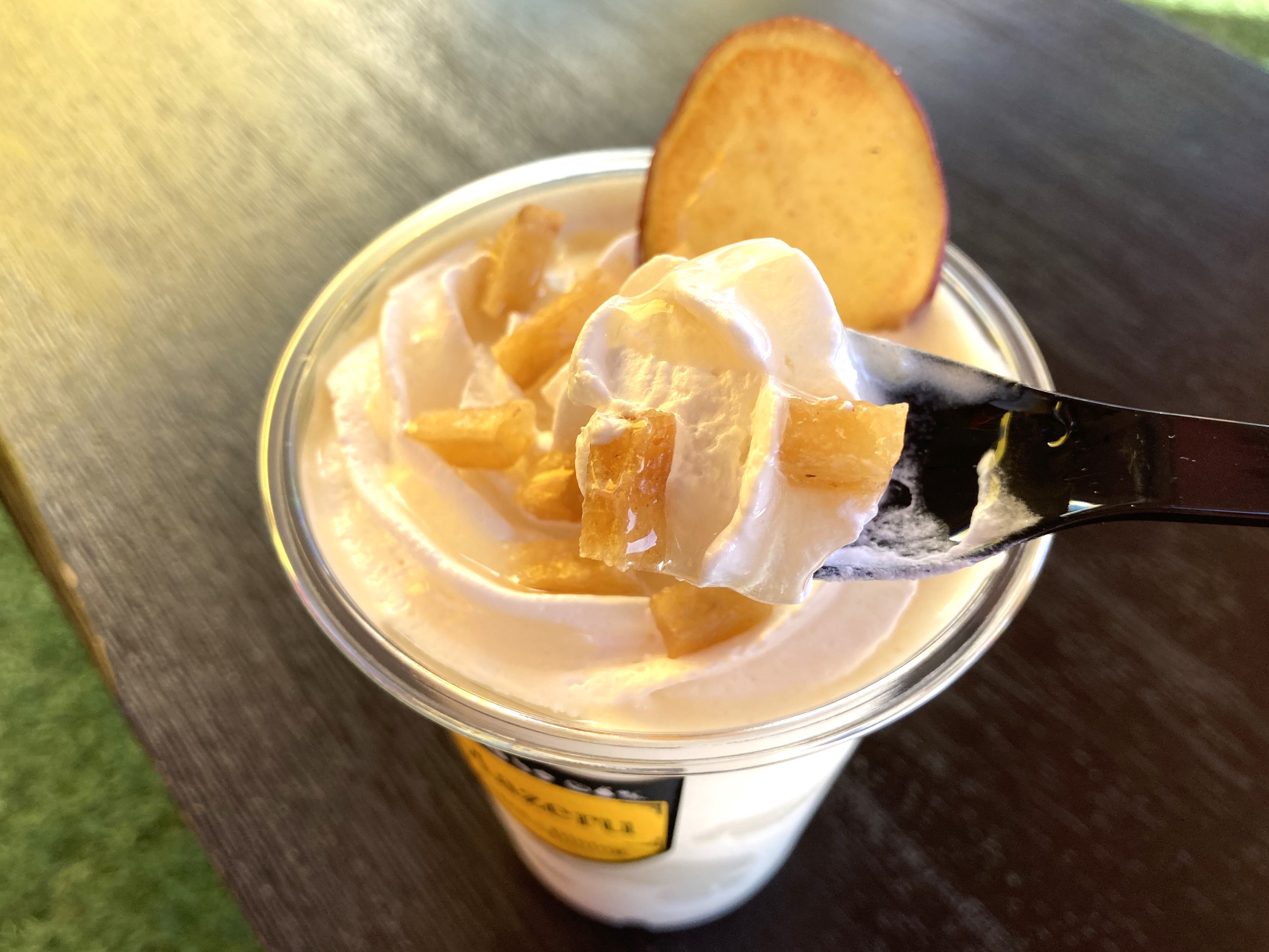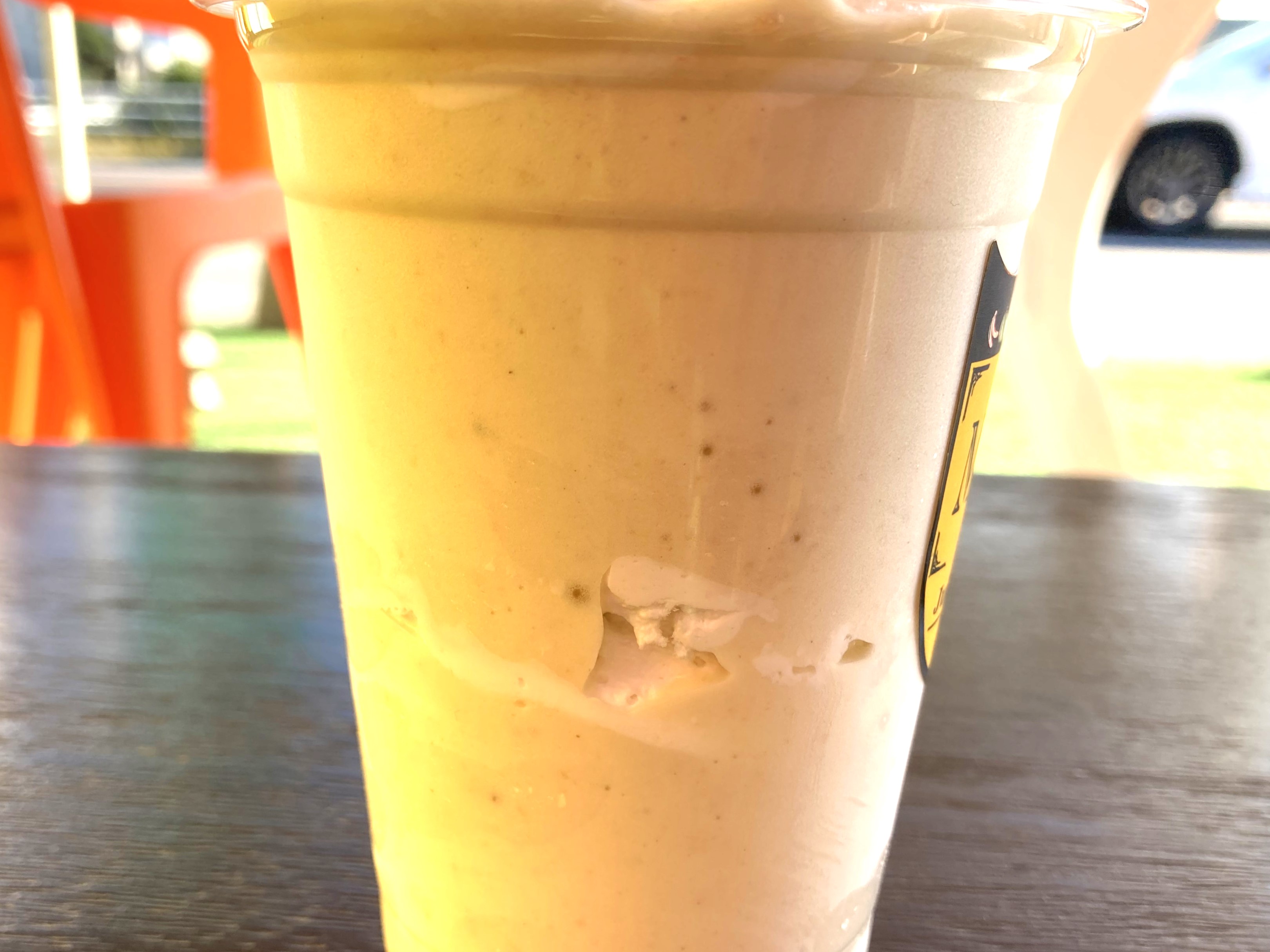 食べてみると、焼いもがとってもクリーミーで、ほんのり香ばしい感じが凄く相性が良い!シェイク自体も甘すぎず、焼いもの自然な甘さなのでずっと食べていられます。ハッキリ言うとこんなシェイク初めて!驚きと感動の波。