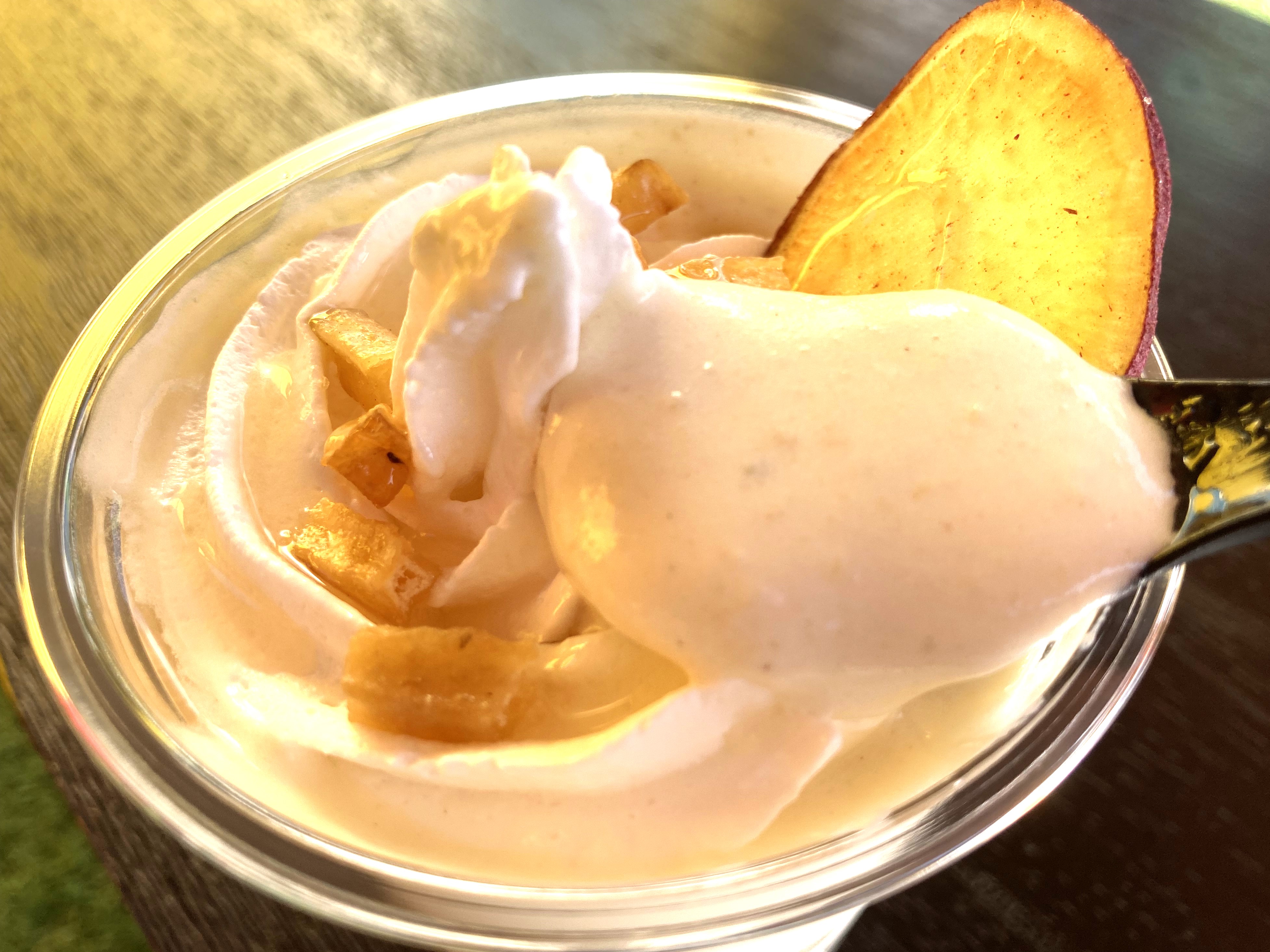 焼いもシェイクはドリンクですが、スプーンで食べるタイプ。さつまいもがたっぷりと入っているので、もったりとしたシェイクです。