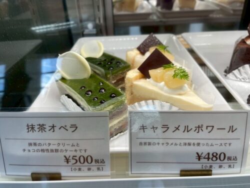 抹茶オペラやキャラメルポワール、ベイクドチーズケーキやガトーショコラなど、いろいろなケーキが並んでいます。