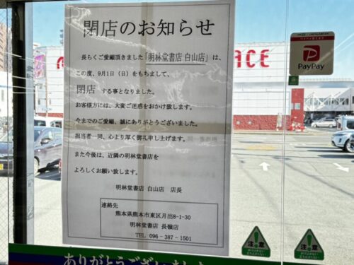 中央区白山にある明林堂白山店が9月1日をもって閉店をします。
