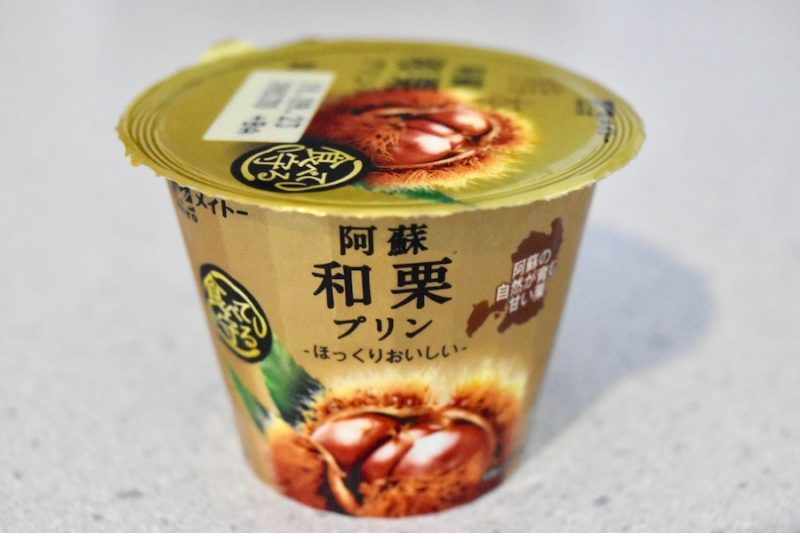 今回紹介するのは「阿蘇和栗プリン」なるもの。黄金に輝くパッケージに高級感ある和栗の写真。メーカーはホームランバーやなめらかプリンを販売するメイトー。毎年、各地域のこだわり素材のプリンを出しているそう。調べてみるとこの「阿蘇和栗プリン」も毎秋に発売され人気だそう。早速「阿蘇和栗プリン」を食べてみました!