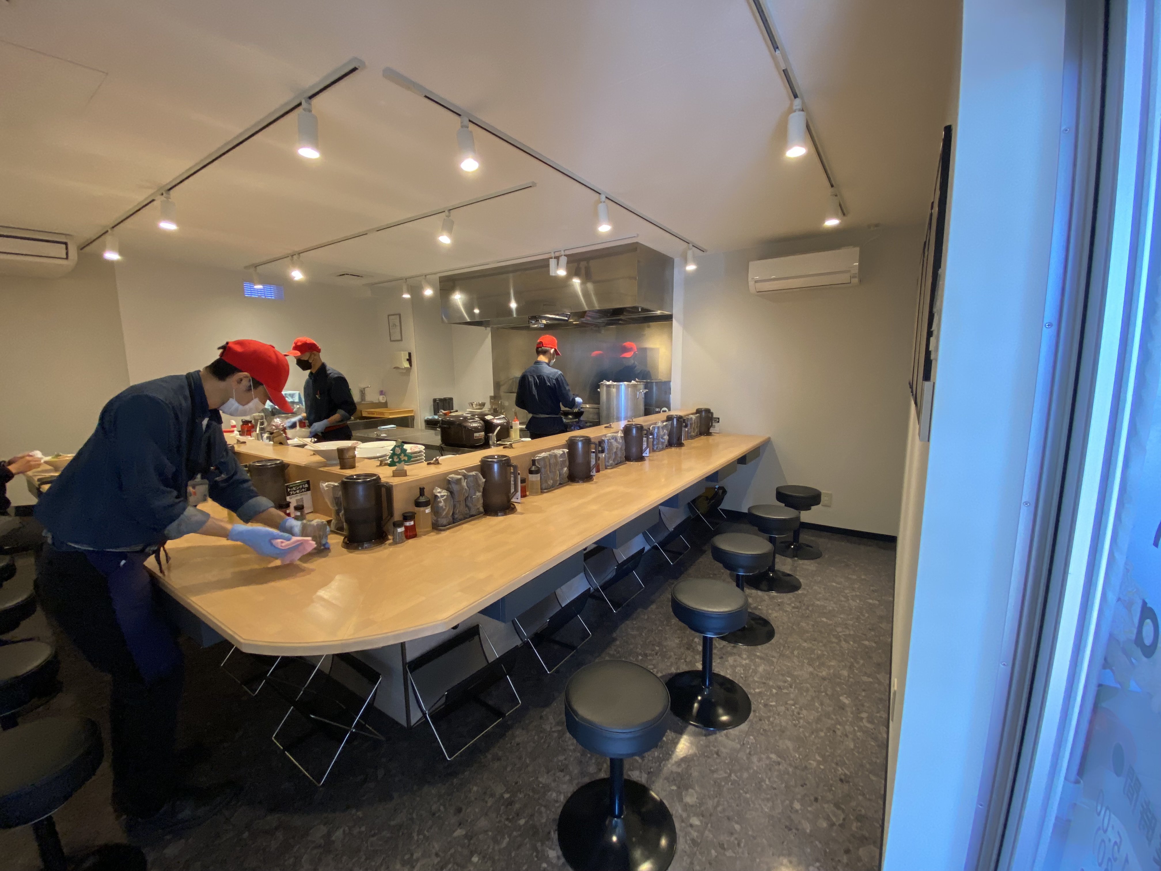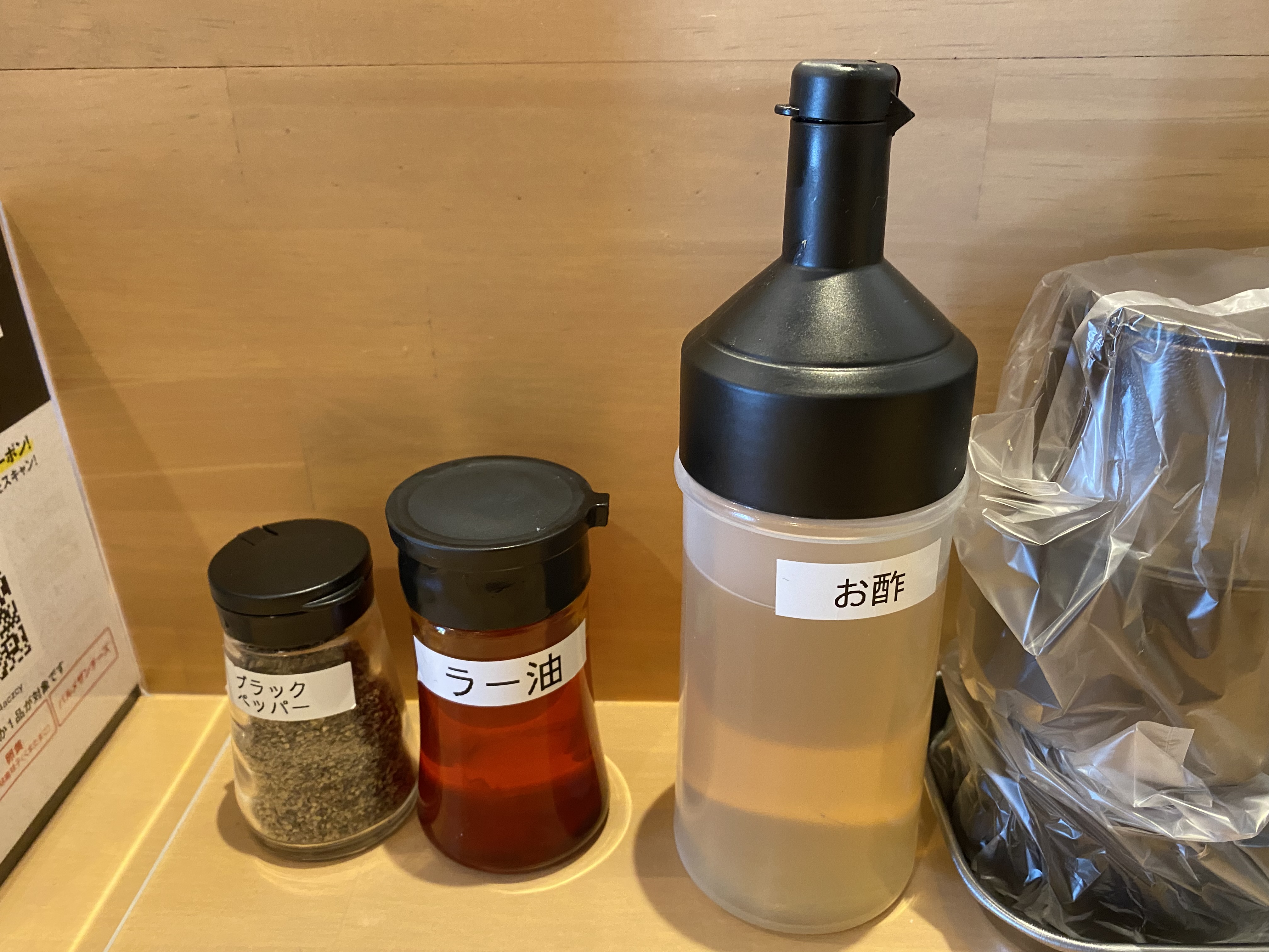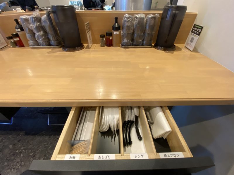 お箸、おしぼり、レンゲ、紙エプロンはカウンター席の引き出しに入っていますよ。