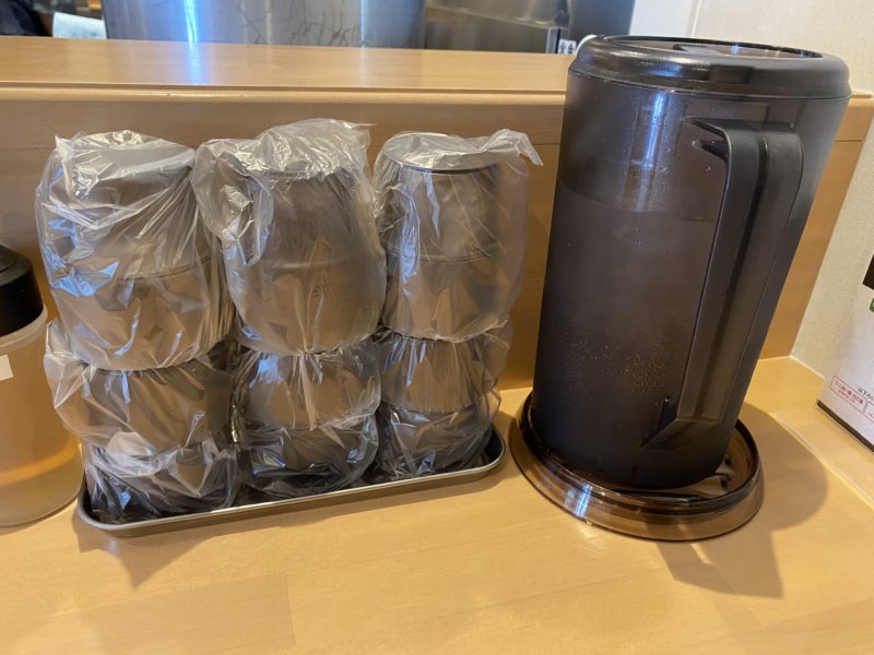 お水はセルフですが、1つ1つコップがビニールに包まれていますので、他のコップに触れることなくお水が注げますね。
